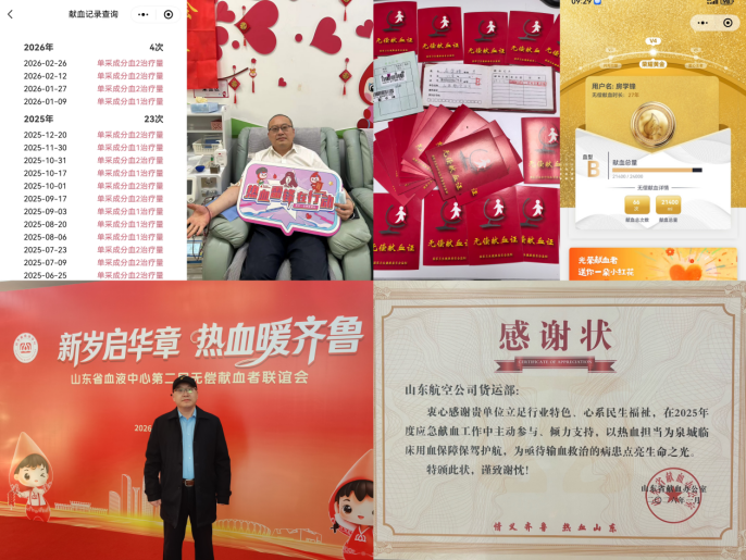 自1998年起,房学锋在公司的统一组织下参加了第一次无偿献血,2015后更是投身无偿献血公益事业成为一名固定献血者,作为山航货运部应急献血者队伍的核心代表,他不仅自己坚持参与献血,更牵头组织队伍开展无偿献血活动,这一干,就是十一个春秋。十一年间,他带领团队累计组织参与无偿献血200余人次,献血总量超90000毫升,这一串数字的背后,是他对生命的敬畏、对公益的执着,更是对“为人民服务”宗旨的生动践行。从第一次卷起衣袖的义无反顾,到如今十余载的初心不改,房学锋的每一次献血,都是一次爱心的传递,为济南泉城临床用血保障筑牢防线,为亟待救治的病患点亮生命之光。